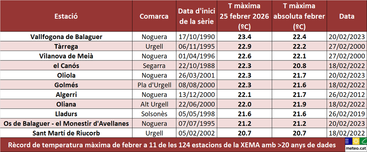 Onze de les 124 estacions (la majoria a Ponent) amb més de 20 anys de dades de la Xarxa d’Estacions Meteorològiques Automàtiques de Catalunya van igualar o van superar ahir el seu rècord de temperatura màxima d’un mes de febrer. A Vallfogona de Balaguer el termòmetre va arribar als 23,4 graus, un més que el màxim fins ara, el 20 de febrer del 2023.