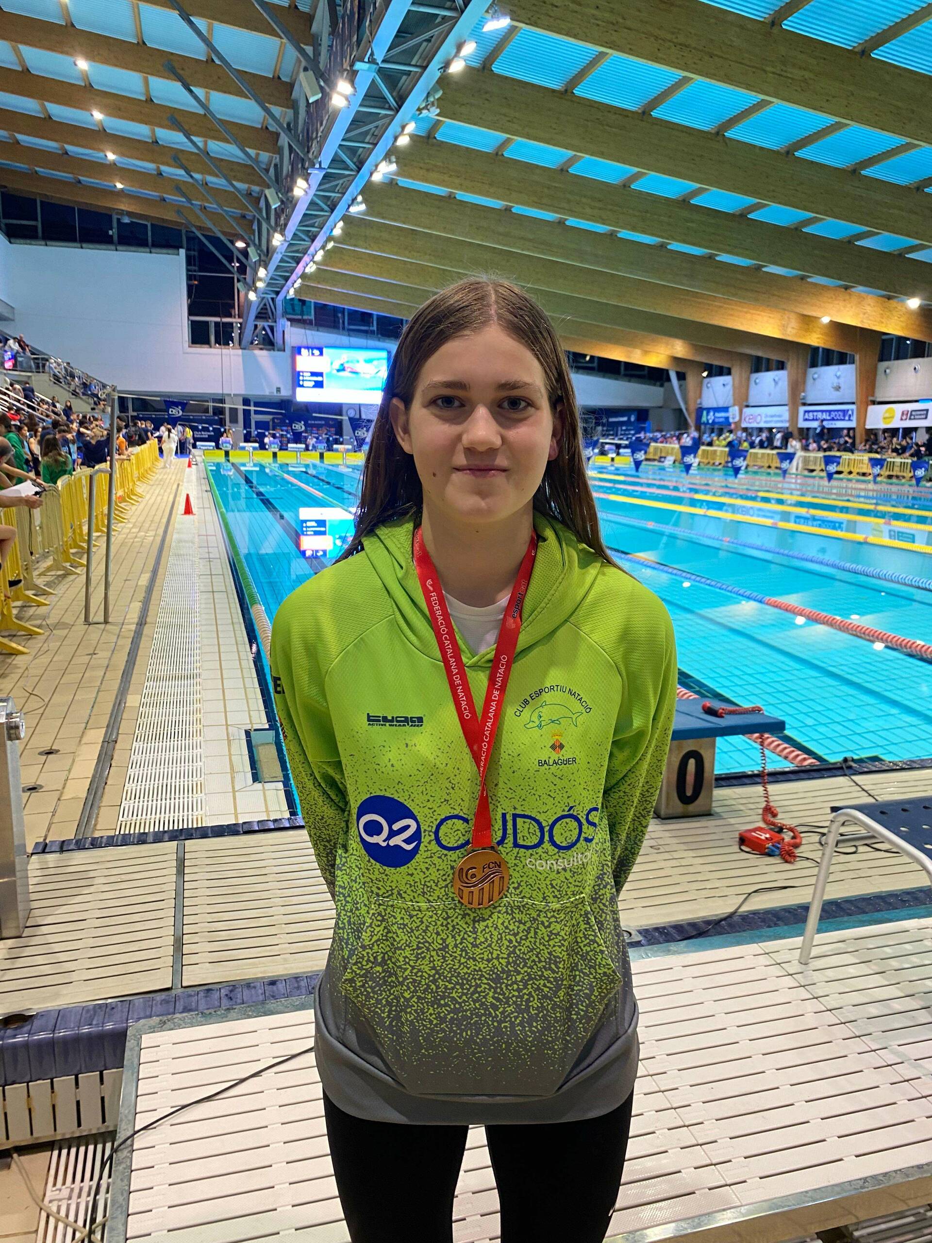 Mateu va confirmar el seu bon moment amb sis finals i dos metalls –plata en 50 papallona i bronze en 100 papallona– que la van situar entre les nadadores més destacades del campionat. Sanmartín, per la seua part, va firmar també una gran actuació per al CEN Balaguer, aconseguint la medalla de bronze en els 100 esquena, obtenint a més la mínima per a l’Estatal amb un registre de 1:08.96, i va tancar el certamen amb un notable sisè lloc en els 400 estils.