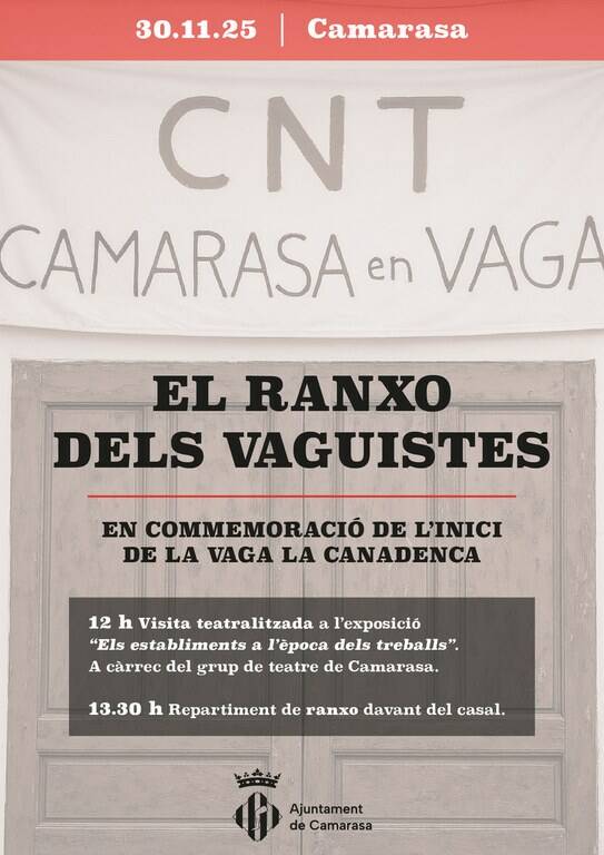 Aquest diumenge, Camarasa recordarà l'esperit solidari del moviment obrer amb la convocatòria del Ranxo dels Vaguistes. Aquesta jornada reivindica l'inici de la Vaga de la Canadenca del 1918, un episodi clau en la conquesta dels drets laborals. Enguany, la celebració posa el focus en els anys de construcció de la presa i la central hidroelèctrica